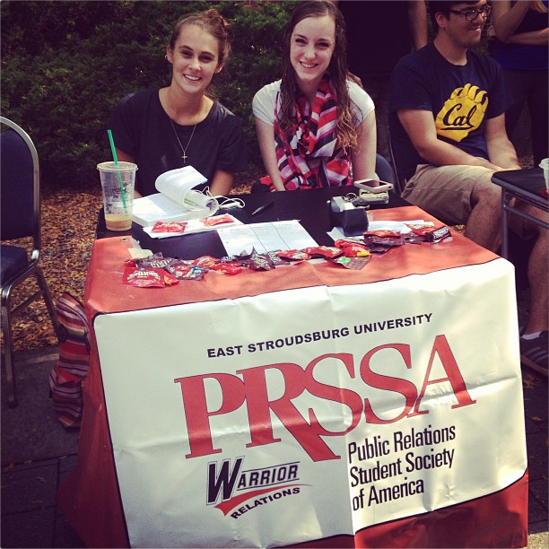 East Stroudsburg, PA – October 2, 2013 – On Tuesday, September 10, 2013, ESU’s Public Relation Student Society of America chapter participated in the annual club fair hosted by Student Senate. PRSSA was amongst over 60 other clubs and organizations that setup a table and provided information to students and faculty. The club fair allowed PRSSA to interact with members of other clubs, speak to potential members from a wide array of majors and interests about PRSSA’s mission, and inform old members of new meeting times and open e-board positions. The club fair proved to be a successful platform for networking and recruitment, as many of the students that stopped by the PRSSA table requested more information and/or attended the first open meeting that was held that afternoon.